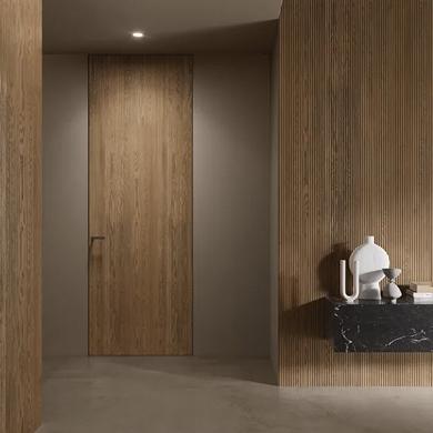 Стильные двери , отличающиеся высоким качеством, сливаются со стеной, создавая бесшовный дизайн.